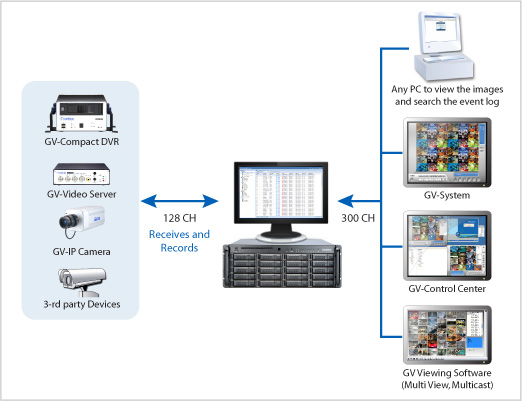 The built-in GV-Recording Server can receive and record up to 128 channels from various IP video devices. In addition, it can simultaneously distribute up to 300 channels to its clients which include GV-System (DVR/NVR system), GV-Control Center (central monitoring system) and Multi View (viewing software). Using the GV-Recording Server, the desired frame rates can be reached while the CPU loading and the bandwidth usage of IP video devices are significantly reduced.